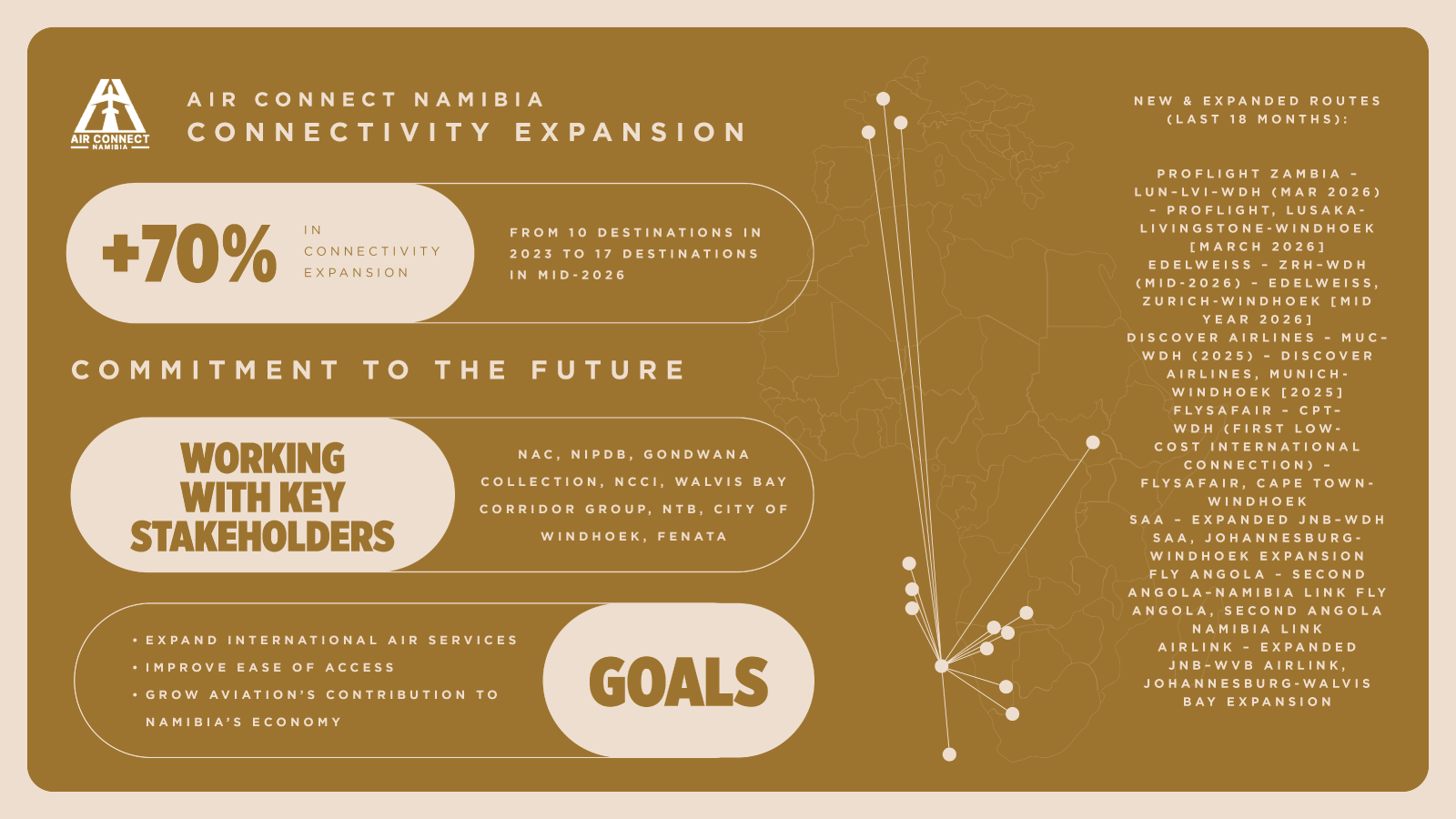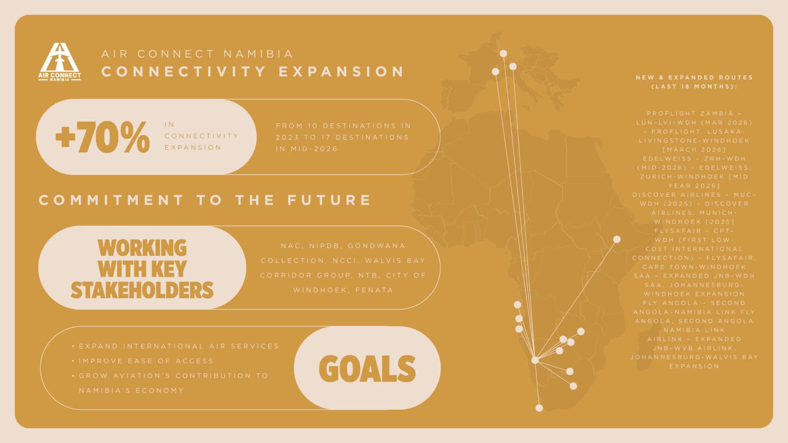 Air Connect Namibia will continue to work closely with its stakeholders - the Namibia Airports Company (NAC), Namibia Investment Promotion and Development Board (NIPDB), Gondwana Collection, Namibia Chamber of Commerce and Industry (NCCI), Walvis Bay Corridor Group, Namibia Tourism Board (NTB), the City of Windhoek and Federation of Namibian Tourism Associations (FENATA) - and domestic industry and global carriers. Together, the project team will work to expand air services, improve ease of access and grow the aviation sector’s contribution to Namibia’s economy.