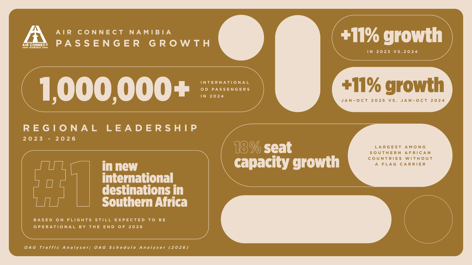 Over the period January–October 2025, Namibia saw passenger number grow by 11%, This came after the country recorded over 1 million origin-destination passengers in 2024 – 11% more than in 2023.