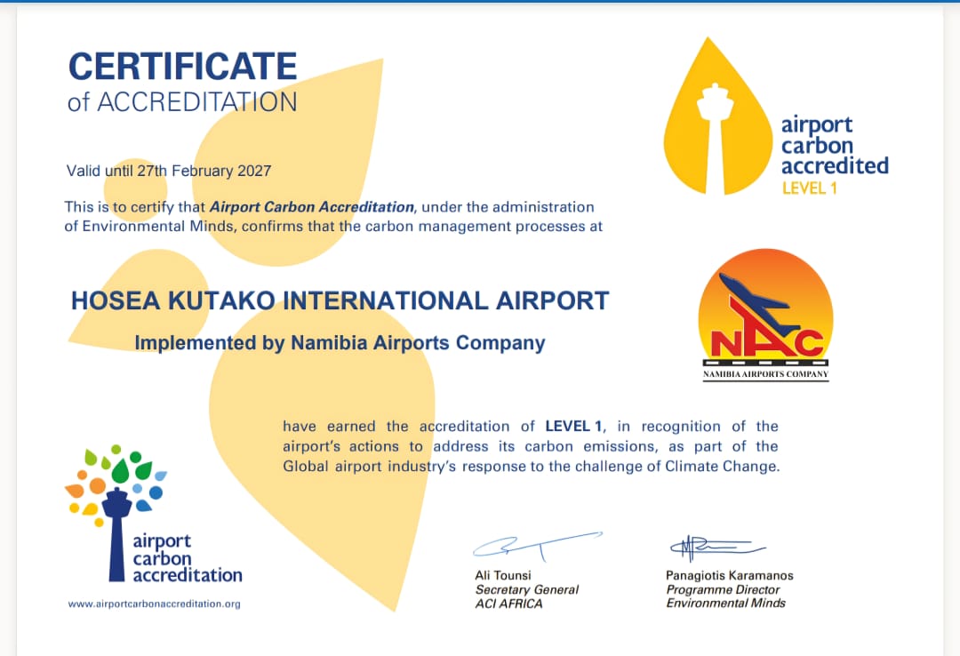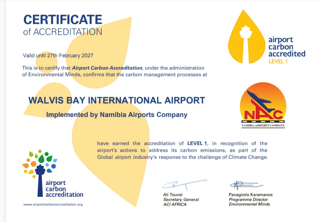 The Namibia Airports Company (NAC) has achieved a significant milestone in its sustainability journey, with Hosea Kutako International Airport and Walvis Bay International Airport attaining Airport Carbon Accreditation (ACA) Level 1. The NAC received the ACA Level 1 certificates from Airports Council International (ACI) Africa in March 2026.
